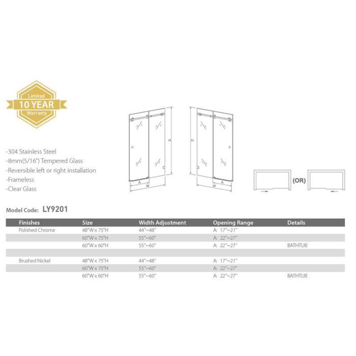 Bathtub door System LY9201 in Brushed nickel or Polished chrome