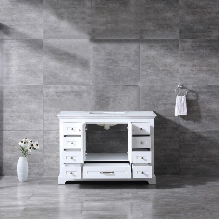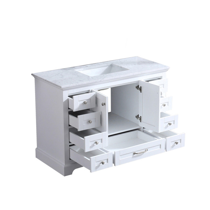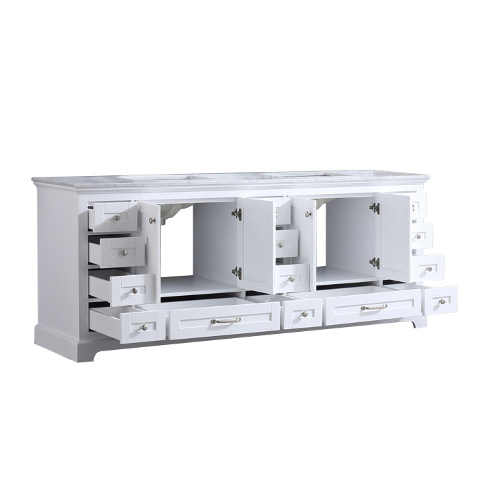 Lexora's Dukes collection conveys the elegant finishing touch you've been searching for through subtle embellishments that exude a timeless attraction. Drawing from classic influences, design and functionality have been upgraded to suit the needs of the modern home. Expertly crafted from solid birch and rubber wood, each vanity is delicately assembled and detailed by hand through an 8-stage treatment process, assuring the lavish allure ensues for years to come. Functionality remains at the forefront of design. Full extension drawers provide copious storage for allocation of essentials and are further complimented by soft closure hardware, promoting quality of life through commodious interaction. Elevate your bathroom design with the timeless appeal of a Carrara marble counterop along with a matching framed mirror, guaranteeing each visit is one to remember.