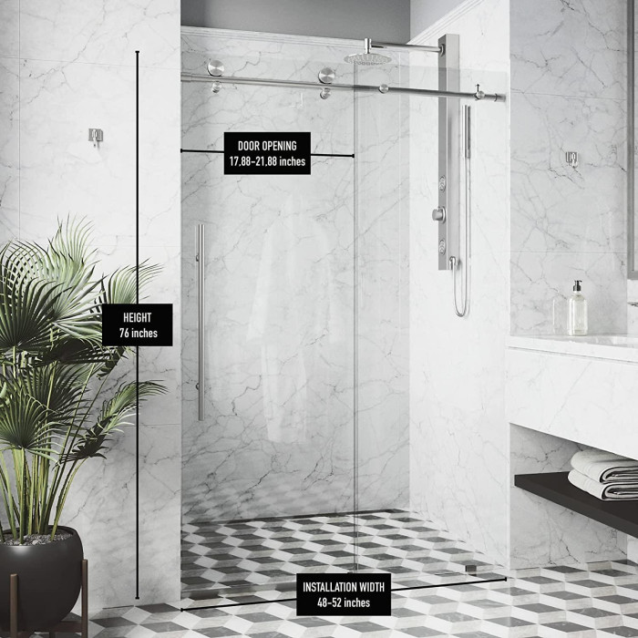 Refined and unobstructed, The Elan E-class by VIGO is a timeless shower door with touches of noteworthy elegance. Sleek hardware adds luxury to thick tempered glass. Its minimalist shower doors allow its classic details to shine. Sky-high frameless sliding doors provide an open concept entryway. Premium quality stainless steel and brass hardware ensure a lifetime of optimal performance. The Elan E-Class is engineered with VIGO’s proprietary technology and is easy to install with a quick and simple installation process. The Elan E-class puts you at the forefront of modern luxury with a design that promises a spa-like shower experience.