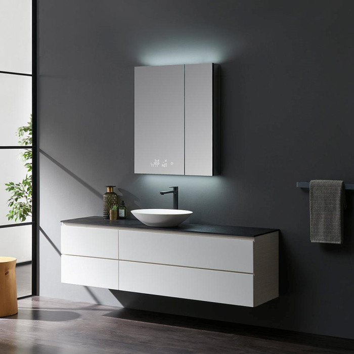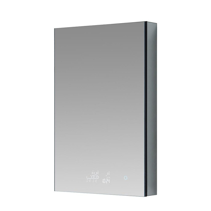 Personalize your bathroom with the Savera range of medicine cabinets. More than a simple storage space, they add a dose of elegance to the most intimate room in your home. A master in functional subtleties, the wide assortment of features on display allow for a tailored welcoming experience during each and every visit. Each cabinet includes a selection of 3 gentle colors of lights with the added touch of a dimmer, while an easy-to-read multifunction display and touch buttons keep you informed and in control of your music to ensure the conditions of your leasure are always met. Through everyday use of the smart systems in place, you will find it impossible to go back to a standarde storage cabinet. The improvements in the quality of life features will set in a new found ambience that is both inviting and soothing