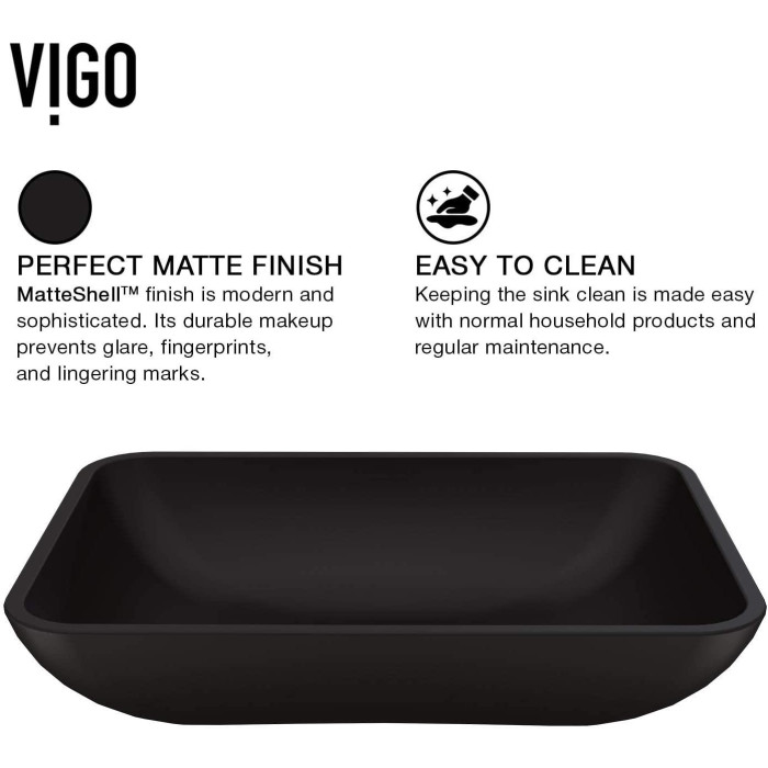 From deliberate design and pristine construction comes the VIGO Black Sottile MatteShell™ Vessel Bathroom Sink. Innovative and intense, MatteShell™ sinks bring the same excellence of classic solid tempered glass sinks and take them to the next level. The Black Sottile is deeply opaque and has an eggshell-like sheen that is rich yet subtle. Its deep ebony shade is infused into the sink itself, eliminating any risk of a chipped finish. The sink also has a fingerprint-free coating to prevent the appearance of marks. The Sottile has a soft rectangular shape with rounded edges. This design makes it easy to maintain and love in the home as a unique piece of functional art. Experience the synergy of character and style all in one with the VIGO Sottile MatteShell™.