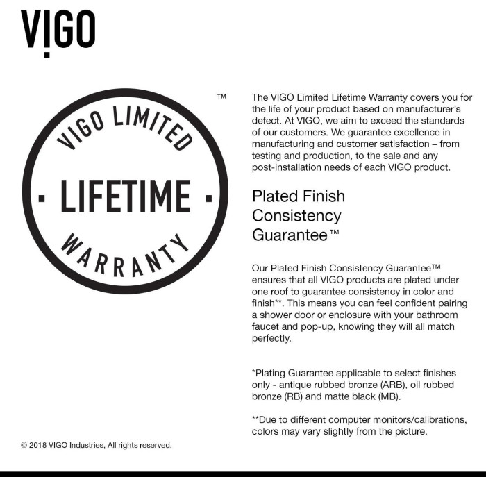 All VIGO shower doors have a Limited Lifetime Warranty
