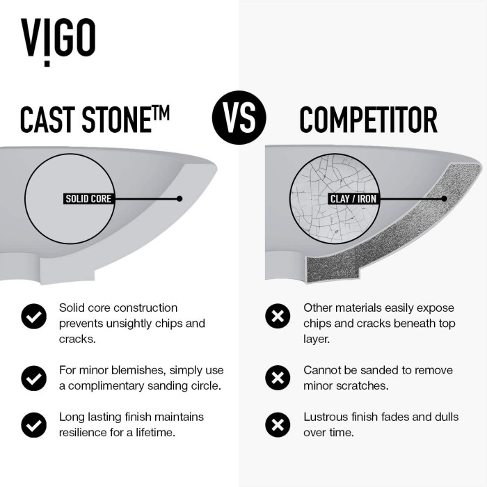 CAST STONE™ COMPOSITE: Natural stone, handmade sink composite material is unique, non-porous, and built with exceptional attention to detail