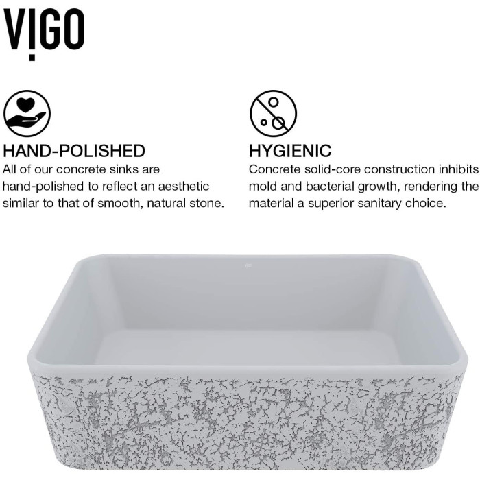 Durably built from all-natural composite, VIGO Cast Stone™ Vessel Bowl Bathroom Sinks offer modernity at its finest. This model is the Aster, a distinctive square design featuring a high-end concrete composite. Solid to the core and non-porous, this hand crafted material expertly resists scratches, stains, and impact. Impressive in build and made to last for years of use, this sink is impeccable in both style and structure. It has a smooth, hand polished interior and a detailed, textured exterior. This sink is easy to keep clean with standard household products and pairs perfectly with any VIGO Vessel or Wall Mount Bathroom Faucet. Complete this set with a matching finish pop-up drain without overflow for a total bathroom sink set.