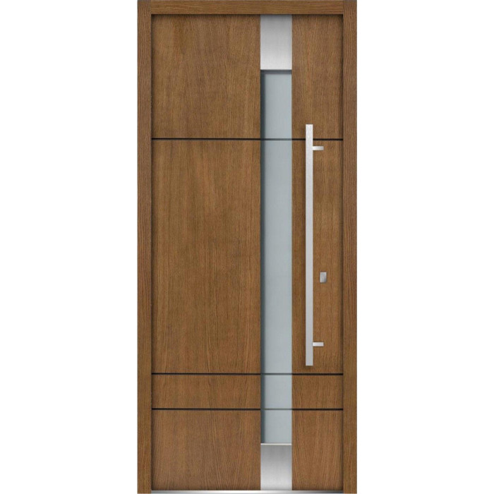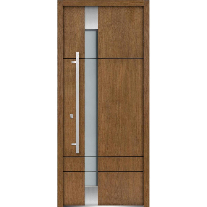 Exterior design - 3 horizontal strips. Vertical insert of the stainless steel parts on the top and bottom; frosted glass with clear glass strips in the middle. Coating of the door - Moisture resistant MDF layer 2/3", oak veneer.