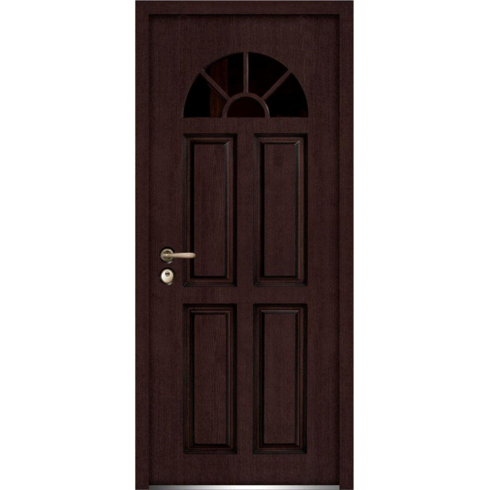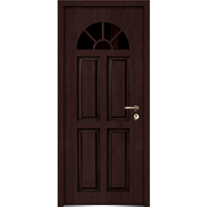 Exterior design - 4 panels, 5 glass inserts. Coating of the door - Moisture resistant MDF layer 2/3", brown veneer.