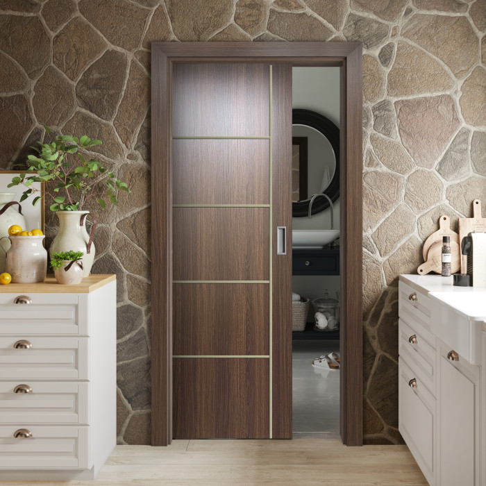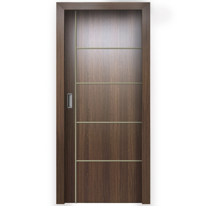 The features of the Orlando door model can be surprising even for professional customers. Valusso Design LLC presents high quality and durability doors with modern style aluminum stripes. Pretty easy in look and fresh in technology of manufacturing, Orlando door makes hearts beat faster. Four horizontal lines, crossed by one vertical line visually give the door ultra-modern view that transfer our consciousness to the future. EDSR (Extra Durable Sound Resistant Hollow Core) high tech technology makes the door durability greater than most solid core doors. The fact that the price for such a door model is lower, it combines as well great durability and high sound insulation, makes this model of the door indispensable detail in every interior of your home.