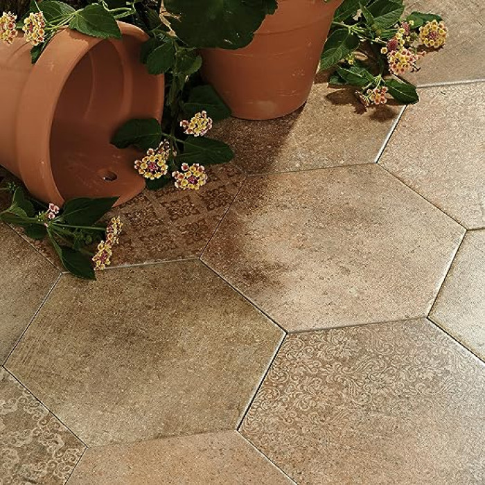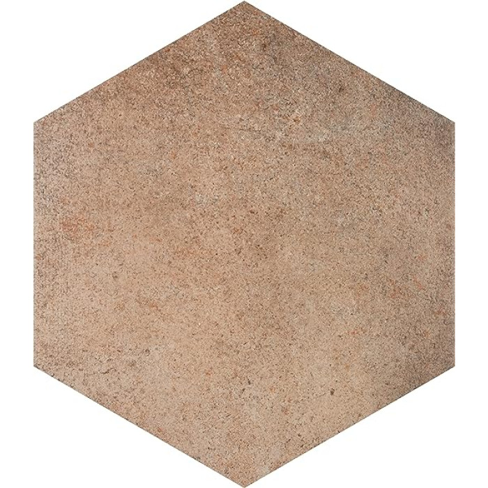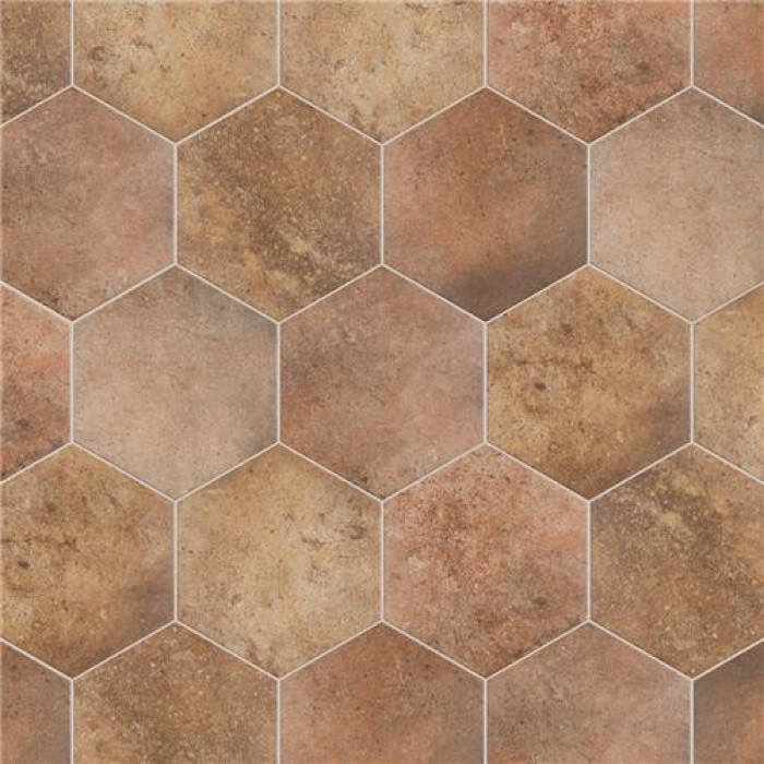 The SomerTile Abadia Hex Natural 8-5/8 in. x 9-7/8 in. Porcelain Floor and Wall Tile features a smooth, matte finish. Inspired by the beauty of natural stone and clay, these varying tiles are great for creating a rustic space. Beautiful shades of tans, browns and terra cotta create a unique design that mimics natural stone. This hexagonal tile is perfect for any setting, traditional enough for historical renovations or modern enough for new construction. Being impervious to water, these tiles are ideal for backsplashes and even offer frost resistance for some exterior work. Use these alone or mix and match with other products to create your own custom look.