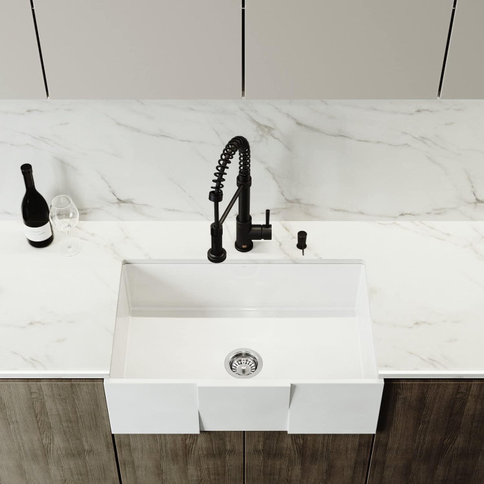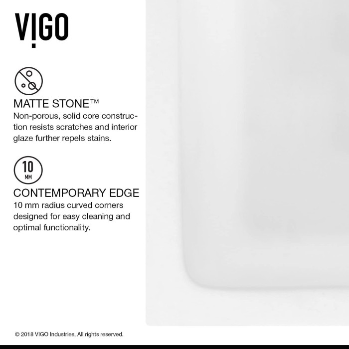 The 30" VIGO Matte Stone Farmhouse Kitchen Sink is constructed from VIGO’s proprietary non-porous solid matte stone that resists stains, while the sink’s 10mm radius curved corners are designed for functionality and easy cleaning. Choose your sink style: Install with either the slotted or flat apron on display for your modern kitchen upgrade. Includes a sink drain strainer and embossed VIGO cutting board.