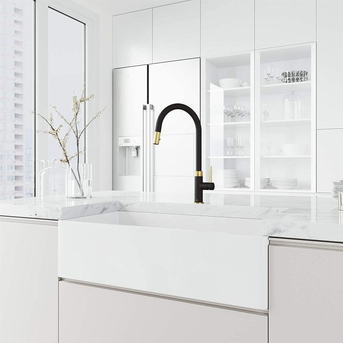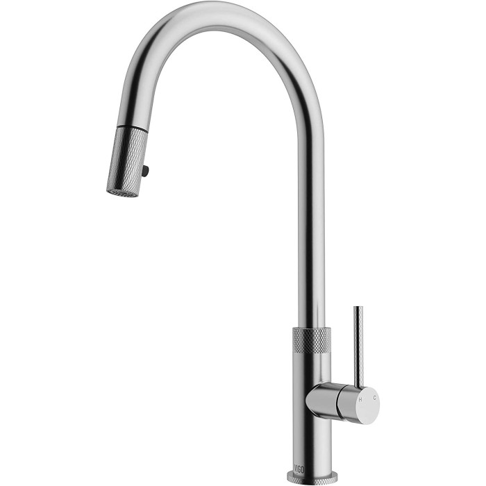 Contrasting textures and smooth finishes mark the beauty and elegance of The Bristol by VIGO. With VIGO’s exclusive 7-layer finish and diamond knurling, this pull-down kitchen sink faucet demonstrates a carefully curated design that highlights its attention to detail. Its dramatic high arch delivers a sleek silhouette and elegantly showcases the quality craftsmanship that marks all VIGO designs. Engineered for performance, it features a dual-action sprayer and single handle lever that elevates the functionality of your kitchen. With a sleek design and innovative technology, The Bristol ensures an exceptional kitchen experience.