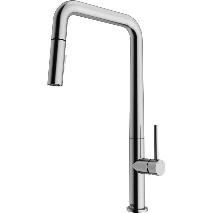 Clean, contemporary, and stylish The Parsons Pull-Down Kitchen Faucet by VIGO showcases a soft squared arch spout and features innovative engineering. A premium finish adds textural charm to its Euro-inspired design and provides an aesthetically charming appeal for any home décor. An exclusive 7-layer finish delivers a smooth surface that lasts for a lifetime. Its rotating swivel spout ensures exceptional maneuverability and performance in the kitchen. The hardware displays quality craftsmanship and intuitive engineering that distinguishes all VIGO designs. The Parsons promises an unprecedented kitchen experience and delivers a powerful performance.